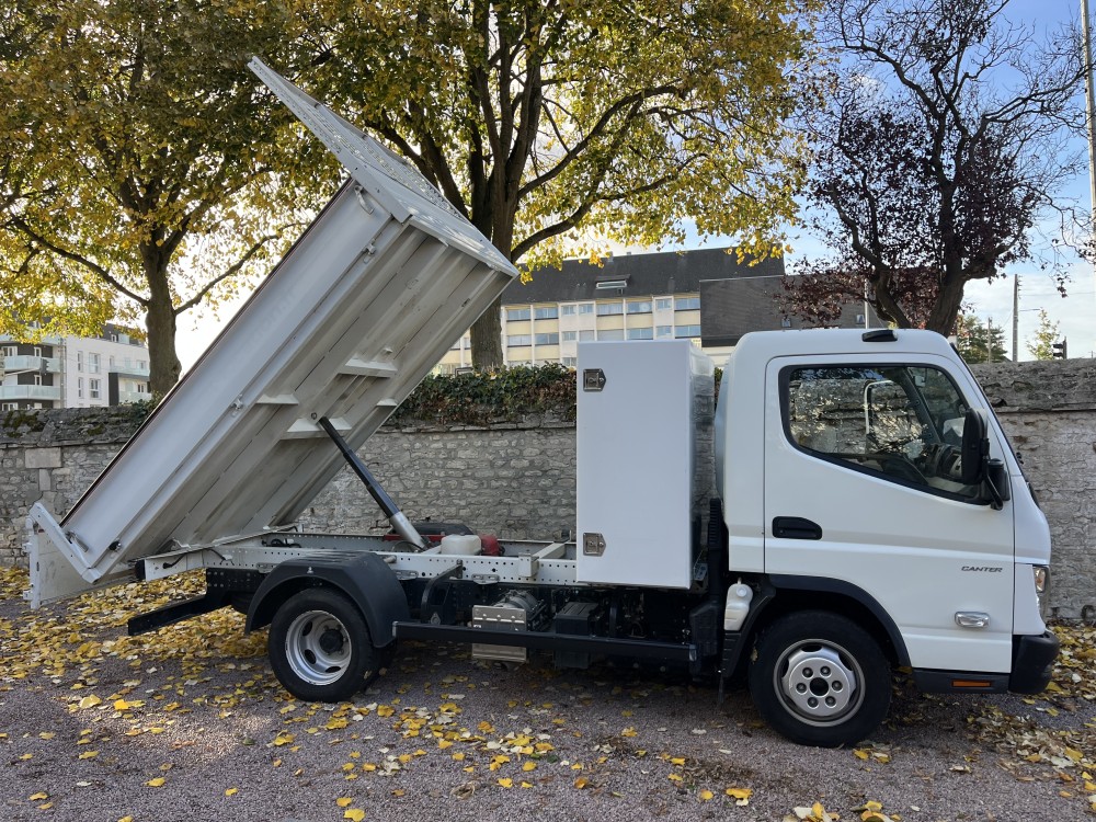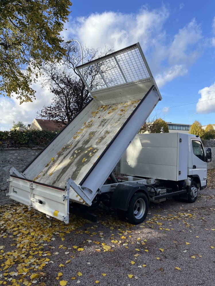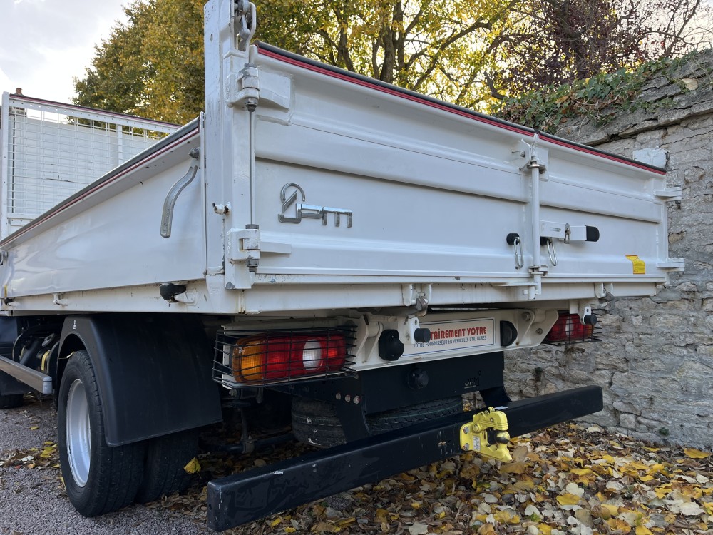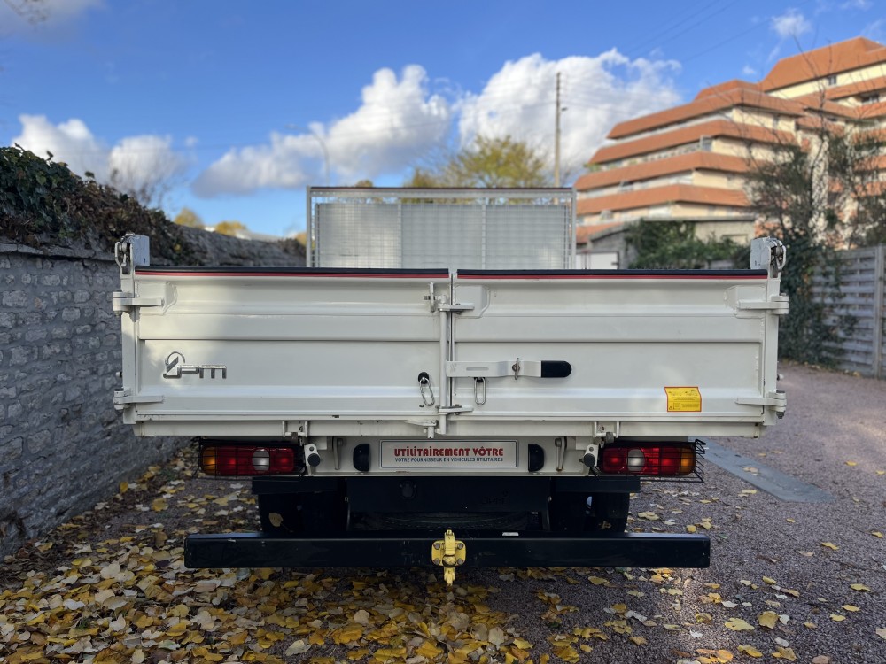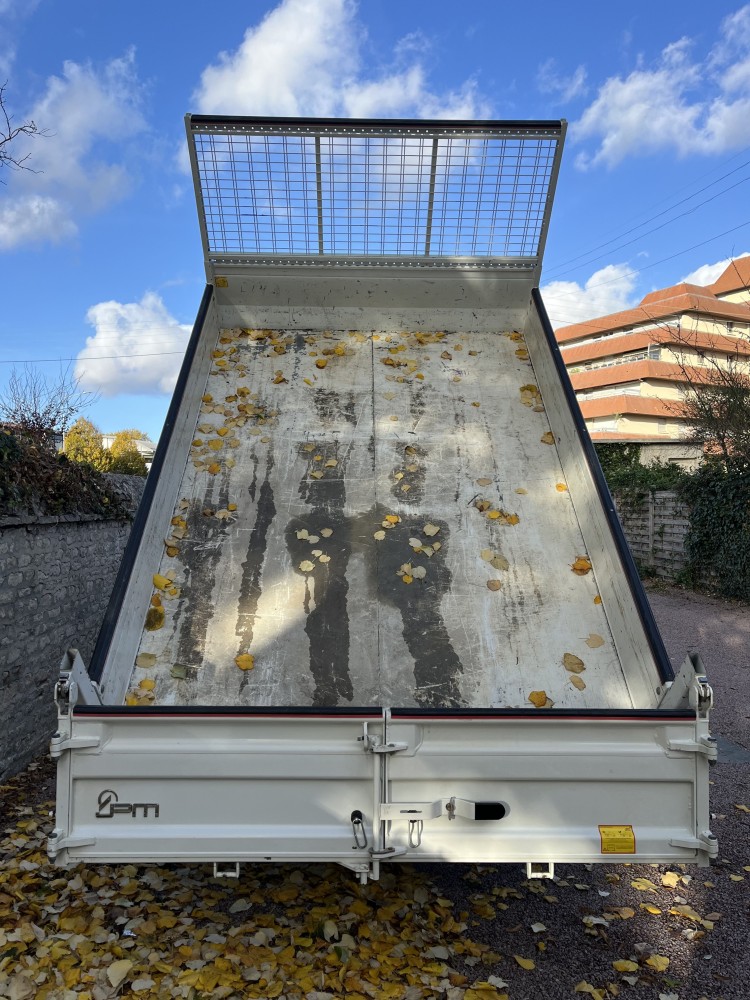 benne simple basculante AR de marque JPM + coffre dos cabine, ridelles latérales rabattables, porte AR à 2 vantaux à décrochage automatique, dispositif d'attelage avec crochet mixte.