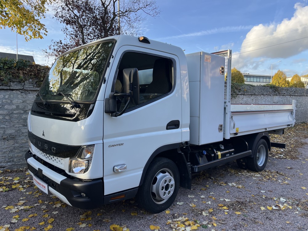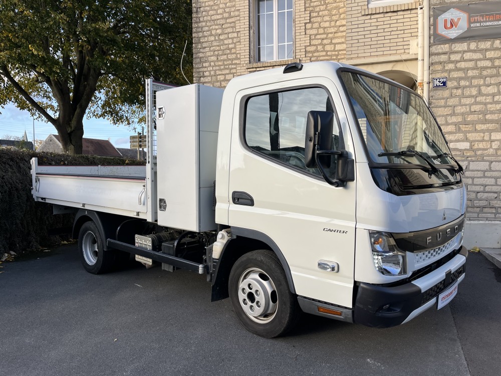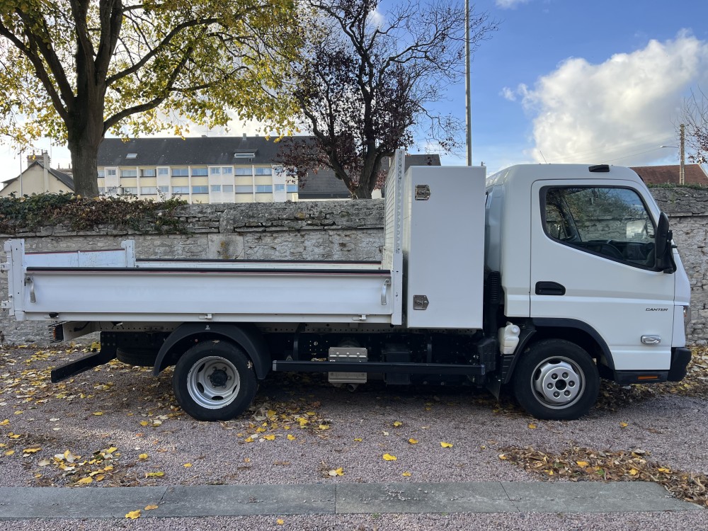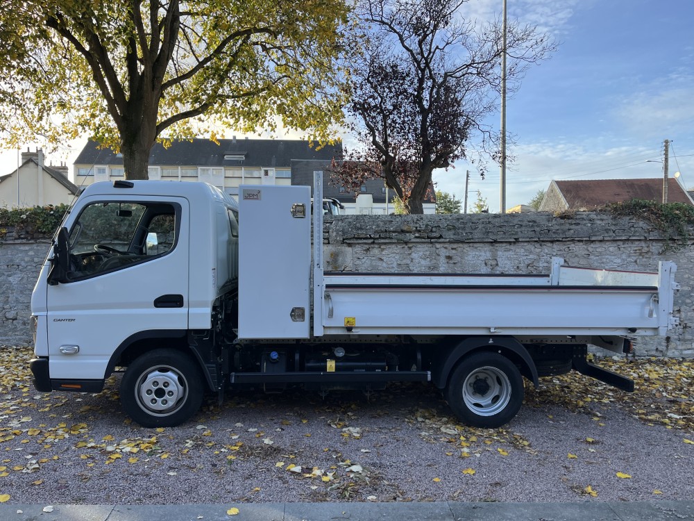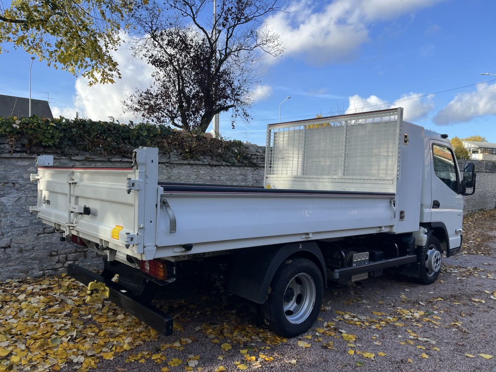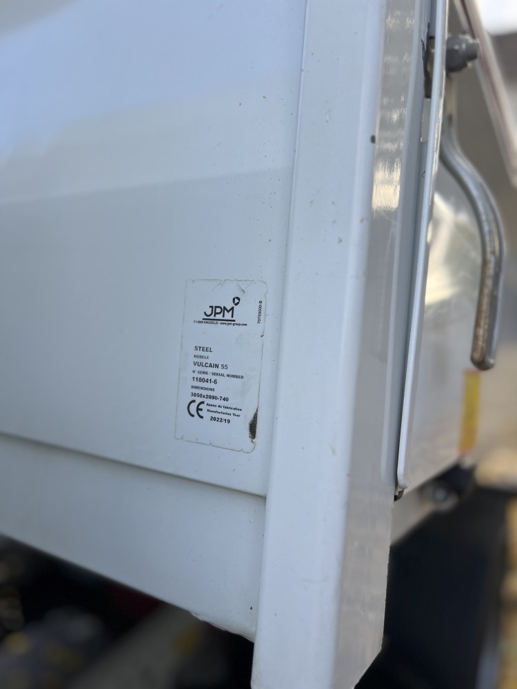 benne simple basculante AR de marque JPM + coffre dos cabine, ridelles latérales rabattables, porte AR à 2 vantaux à décrochage automatique, dispositif d'attelage avec crochet mixte.