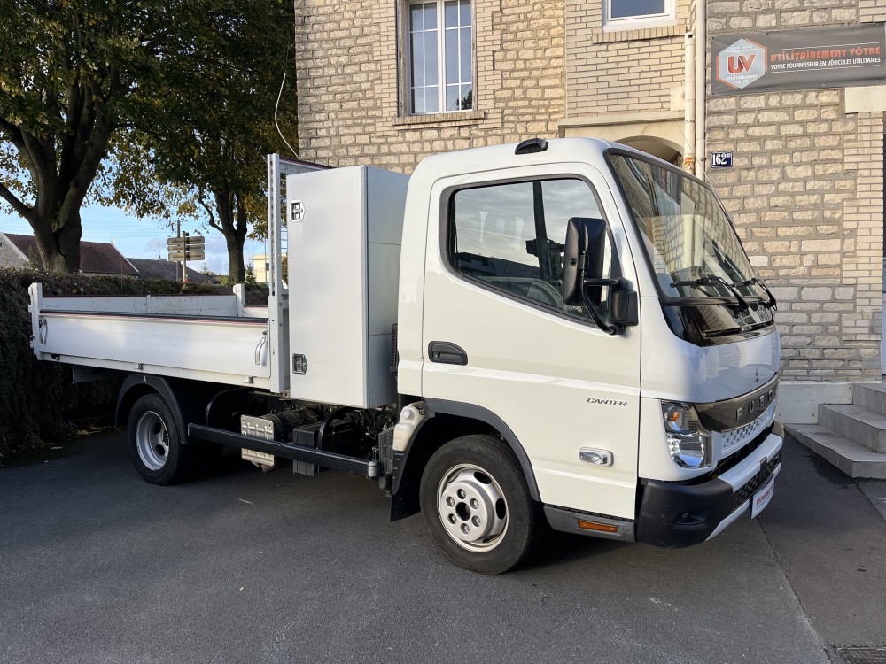 benne simple basculante AR de marque JPM + coffre dos cabine, ridelles latérales rabattables, porte AR à 2 vantaux à décrochage automatique, dispositif d'attelage avec crochet mixte.