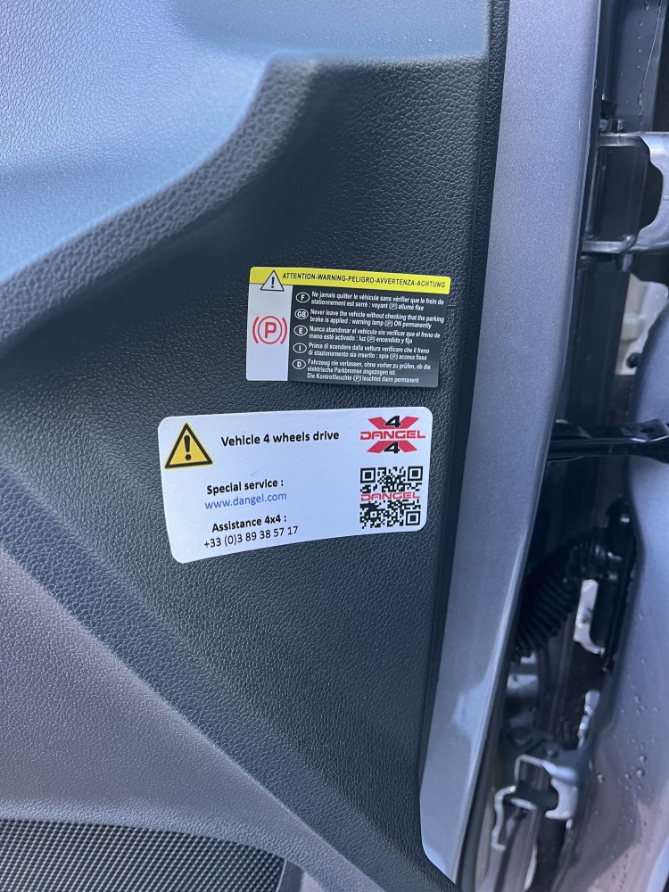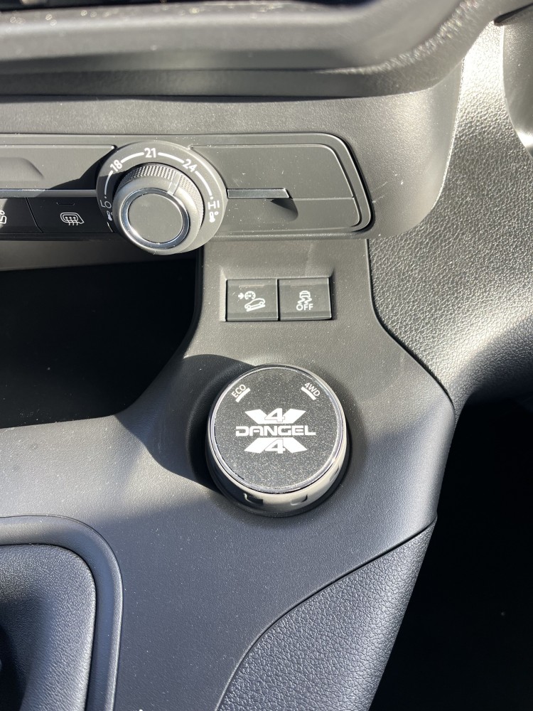 transmission 4x4 viscocoupleur avec contrôle de traction électronique couplé à l'ESP spécifique DANGEL sur les 4 roues, réhausse de caisse, tôle de protection des organes sensibles (moteur/boîte, réservoir carburant), gestion du mode 4x4 via la molette de modes sélectionnables "ECO 2WD ou AUTO 4WD".